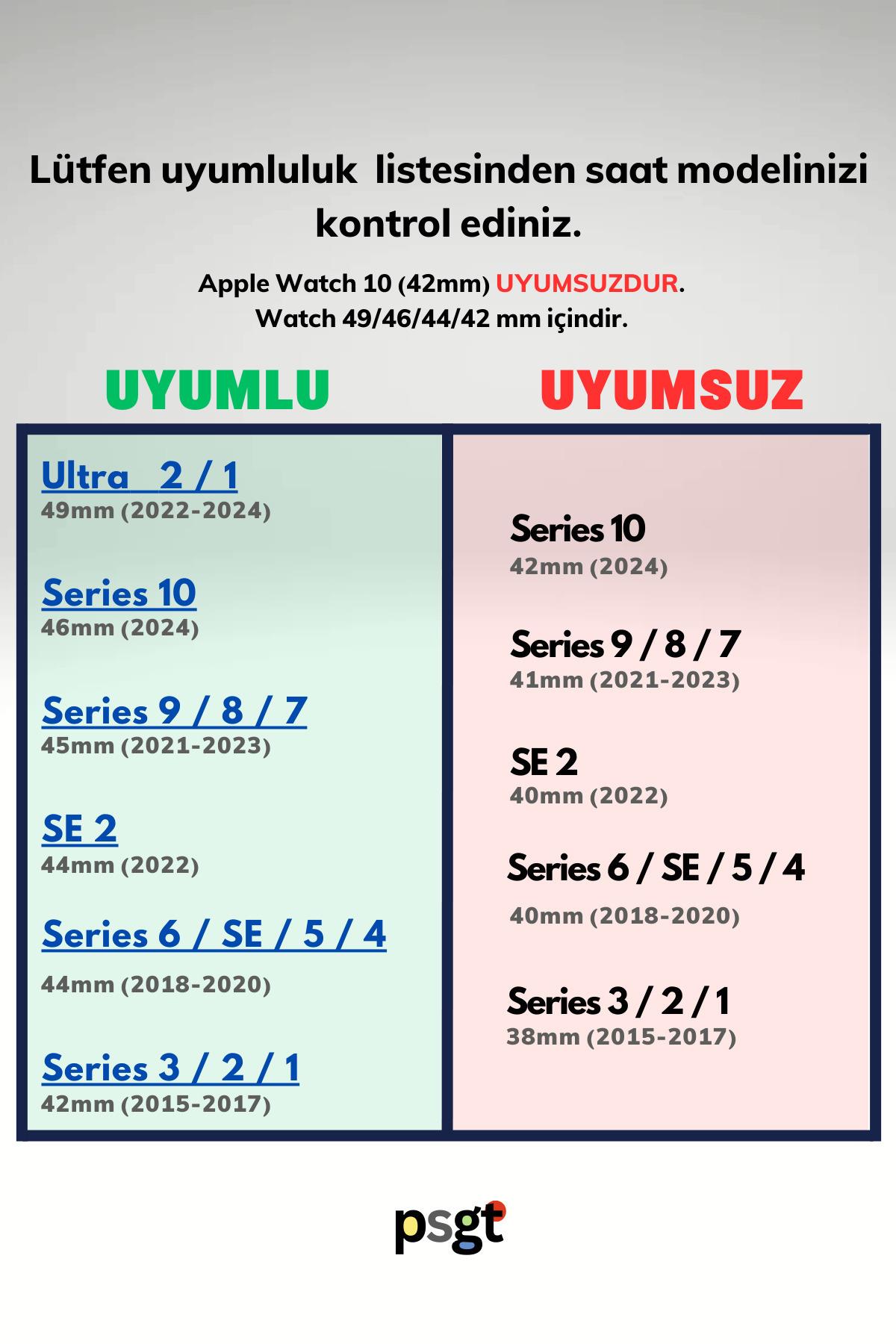 Apple Watch serisi ile tam uyumlu, 42mm, 44mm, 45mm, 49mm, 1/2/3/4/5/6/se/7/8/9, ultra; ultra; ultra2 modelleri için ideal kordon seçeneği; Yüksek kaliteli silikon materyalden üretilmiş olup, uzun süreli kullanımlarda bile konforlu bir deneyim sunar; Esnek yapısı sayesinde farklı saat modellerine kolayca uyum sağlar ve kayışın kaymasını önler; Renk seçenekleriyle kişisel tarzınıza uygun bir aksesuar olarak günlük kullanımınıza şıklık katar;